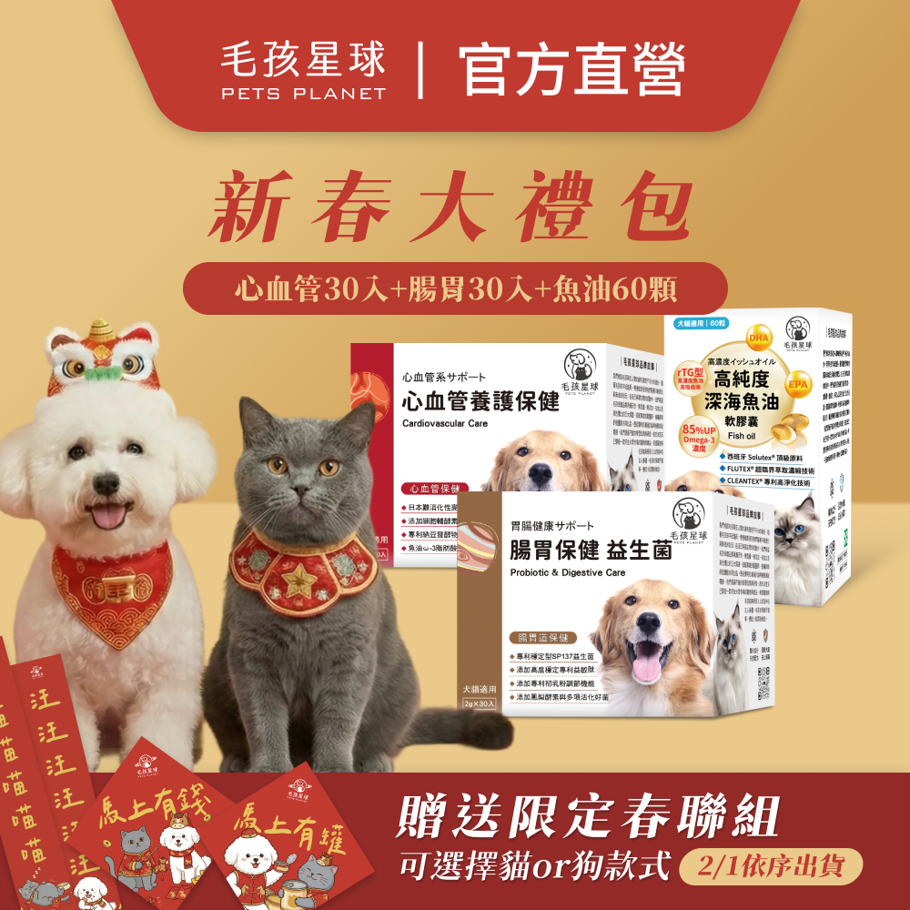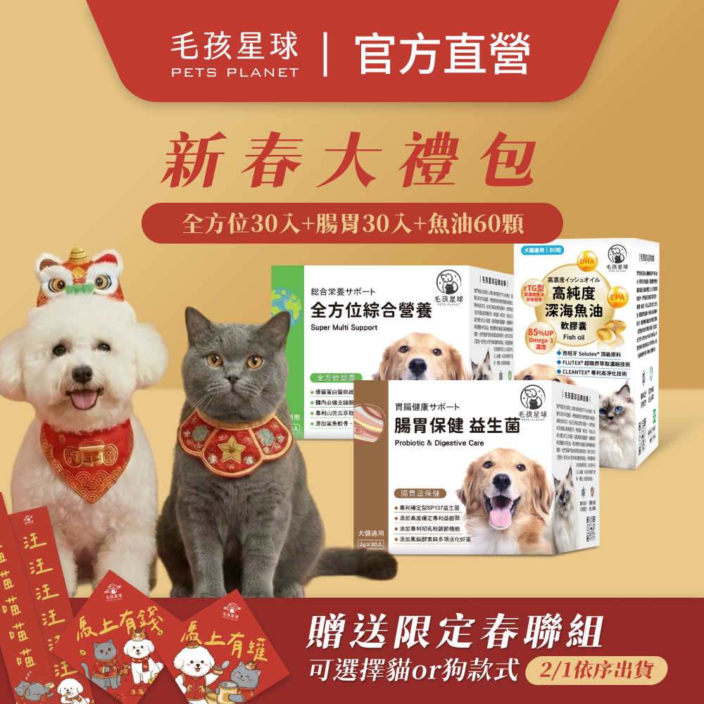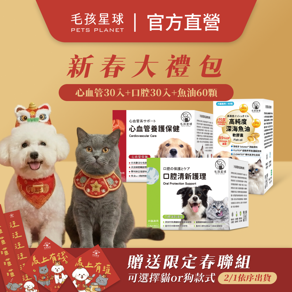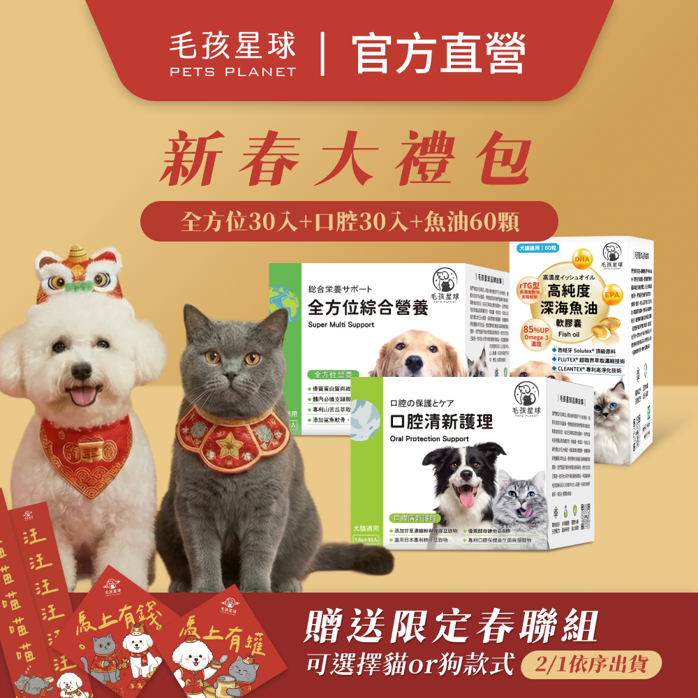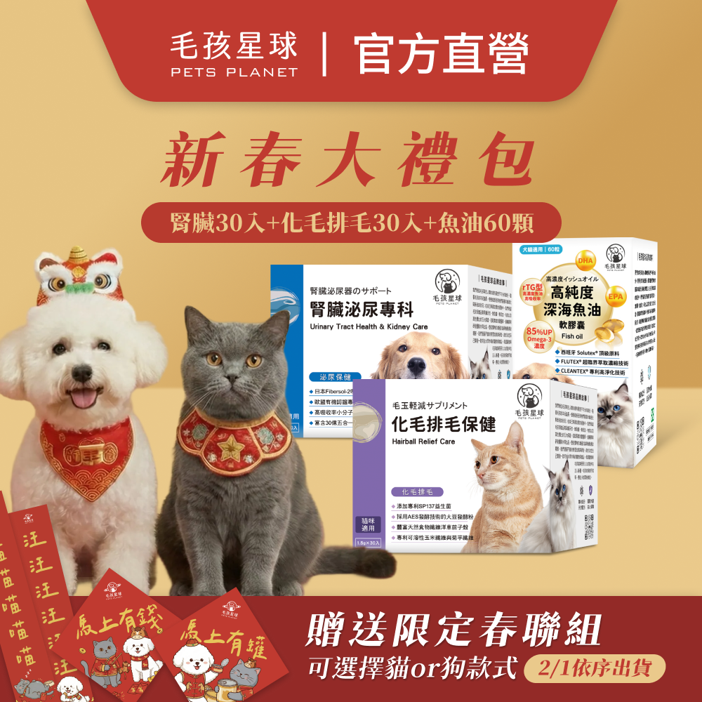 品名:【毛孩星球】2026馬年新春大禮包┃ 深海魚油60入+化毛排毛保健 / 腸胃保健 / 口腔保健 +腎臟泌尿保健 / 全方位綜合 / 心血管保健┃ 贈送毛孩星球春聯